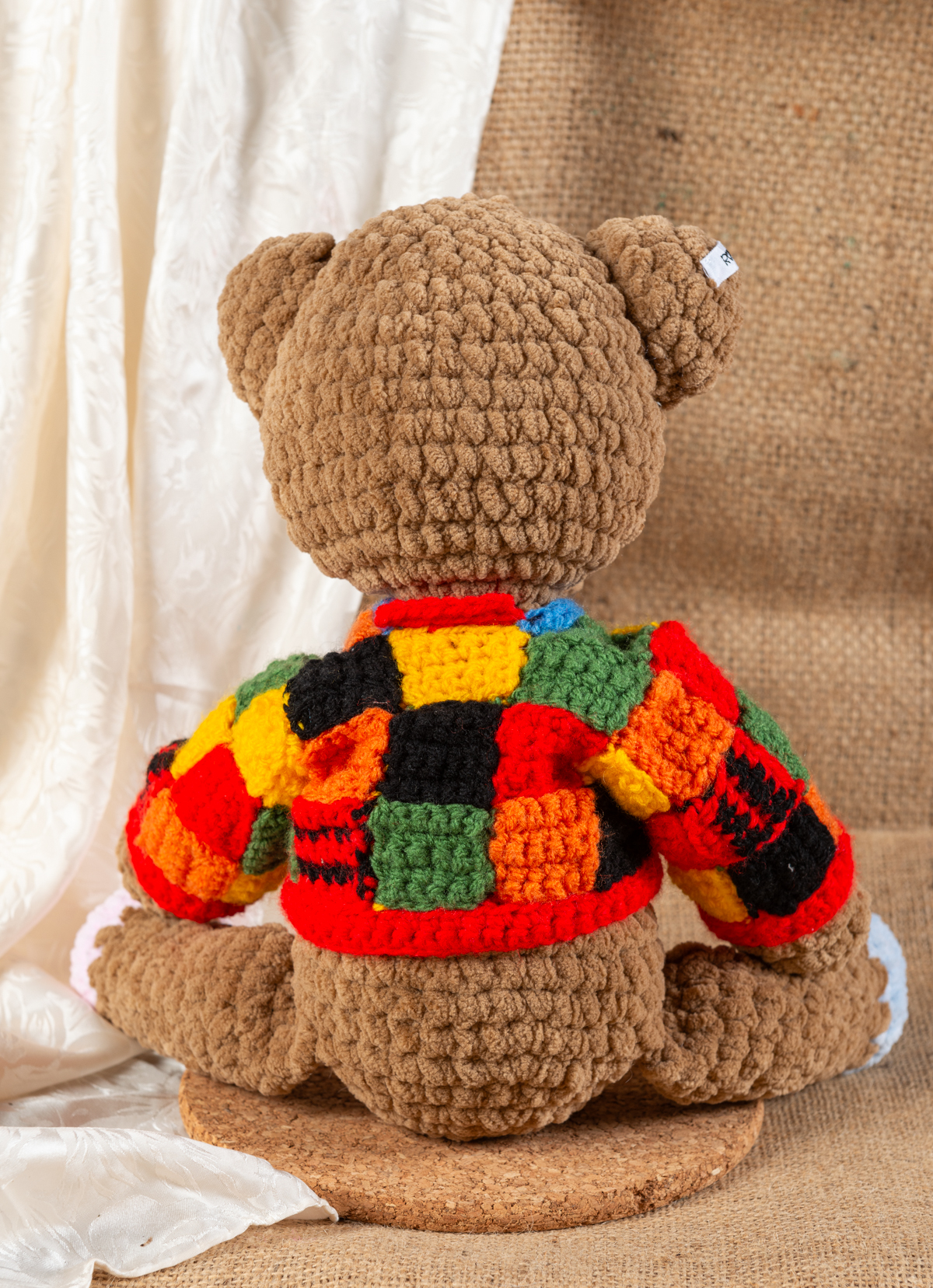 Der handgemachter Bär aus flauschiger Chenillewolle ist rund 45 cm groß, weich gefüllt und damit perfekt zum Kuscheln, Verschenken oder einfach Liebhaben. Sein besonderes Highlight ist die farbenfrohe Häkeljacke im Harry-Styles-Cardigan-Look, gefertigt aus hochwertiger Baumwollen-Garn.