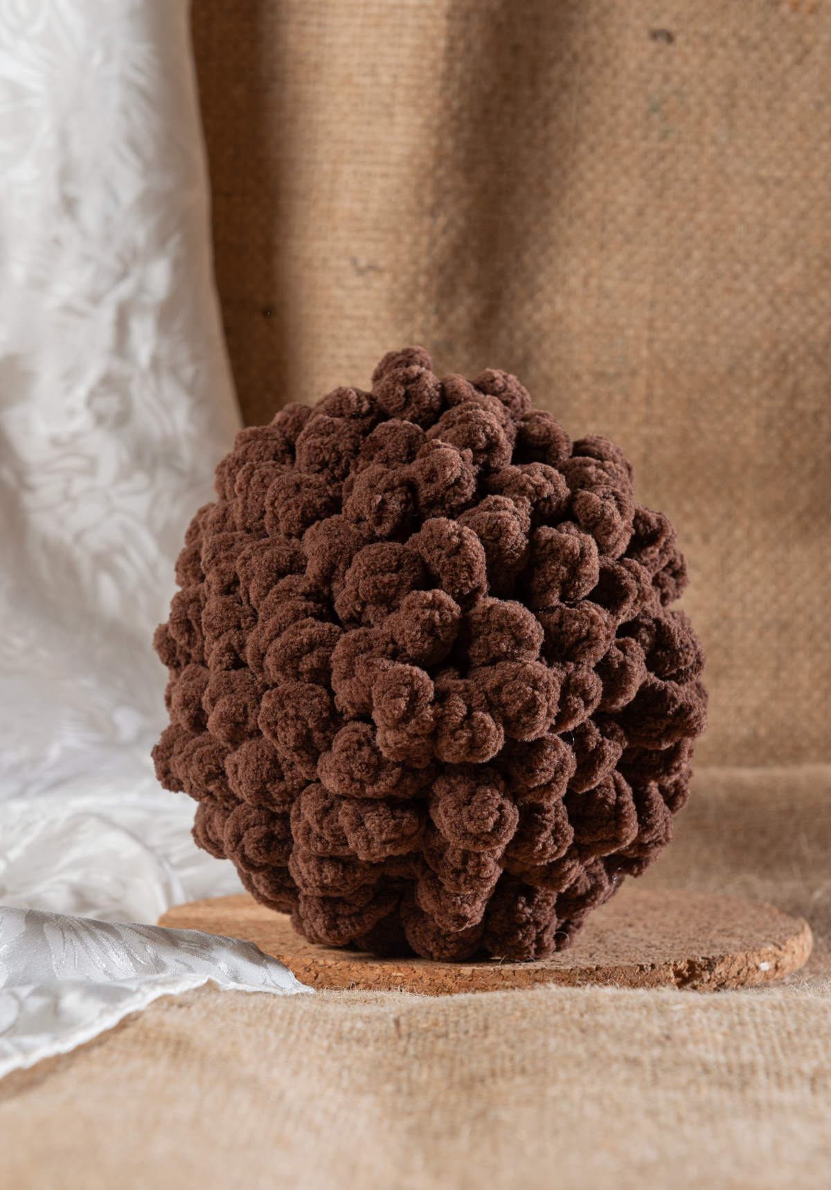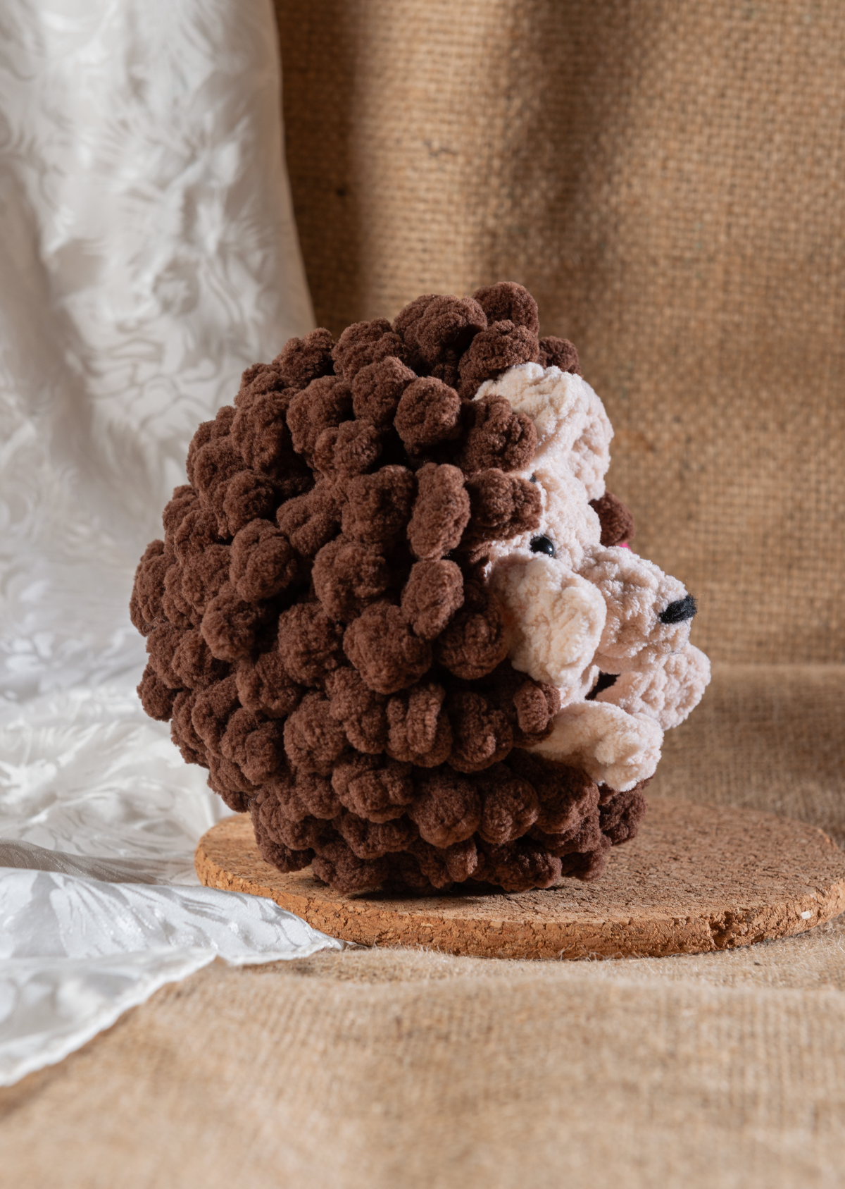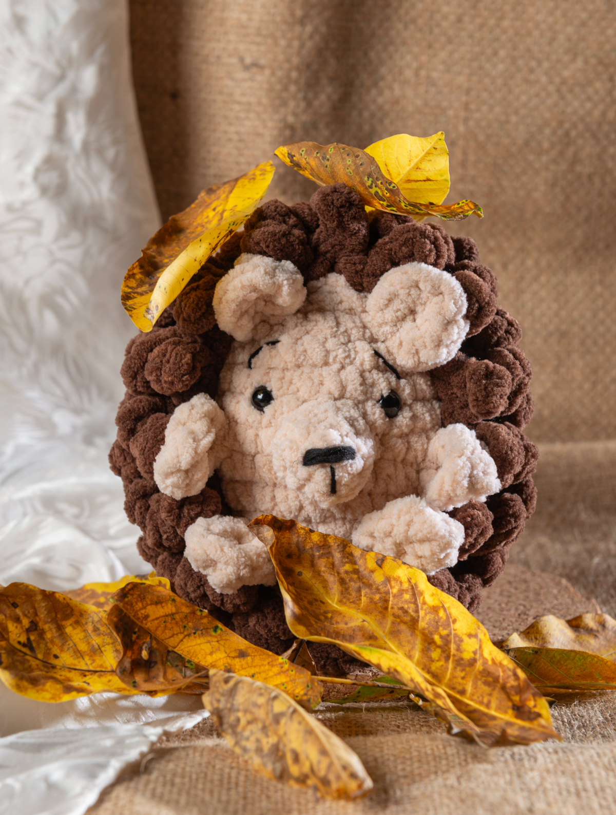 Mit seiner dichten, dunkelbraunen „Stachelmähne“ und dem beigen Körper bringt Pino jede Menge Kuschelfaktor ins Zuhause. Er ist aus flauschiger Chenillewolle gehäkelt, trägt gestickte Nase, sichere Augen und misst ca. 17 cm in der Höhe.
