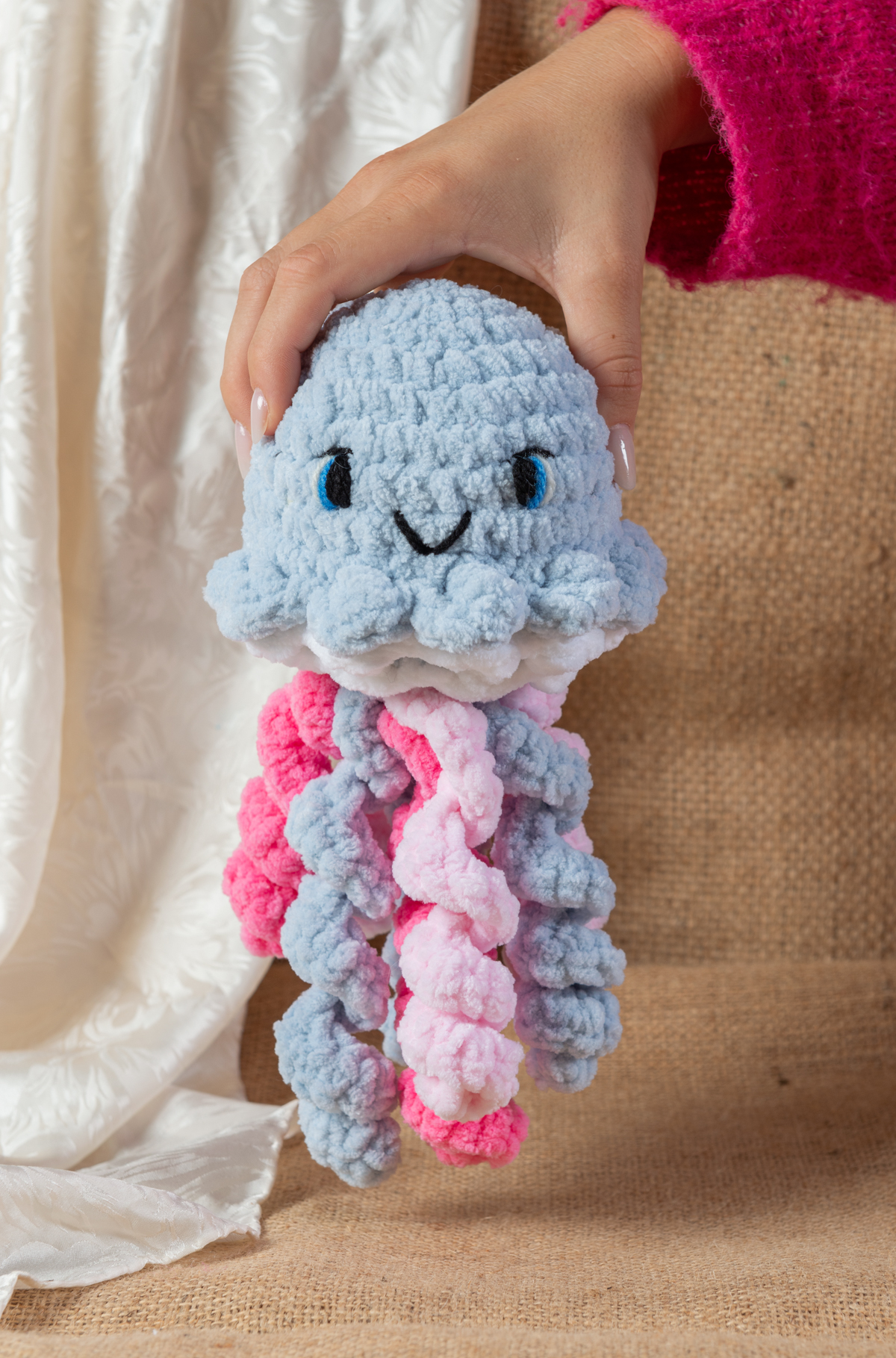 Aurelia fällt sofort durch ihre bunten Tentakel in Rosa, Pink, Hellblau und Weiß auf. Sie ist aus weicher Chenillewolle gefertigt, mit Füllwatte gestopft und dadurch herrlich flauschig. Die Augen sind gestickt, können aber auf Wunsch auch als Sicherheitsaugen gearbeitet werden – einfach bei der Bestellung angeben.